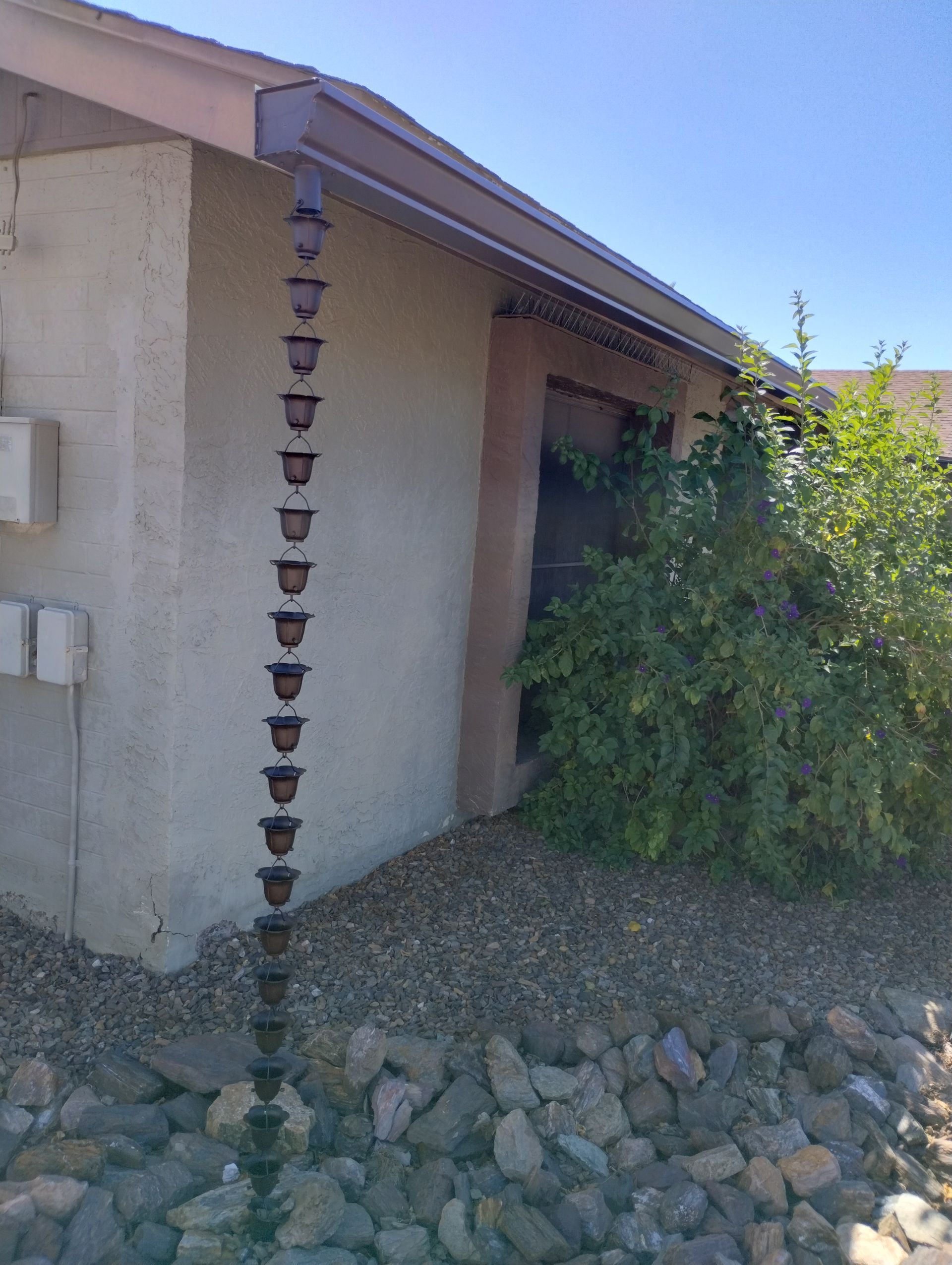 The home owner wanted a more decritive look. We added a 6" Seamless Gutter with a Flower Cup rain chain.