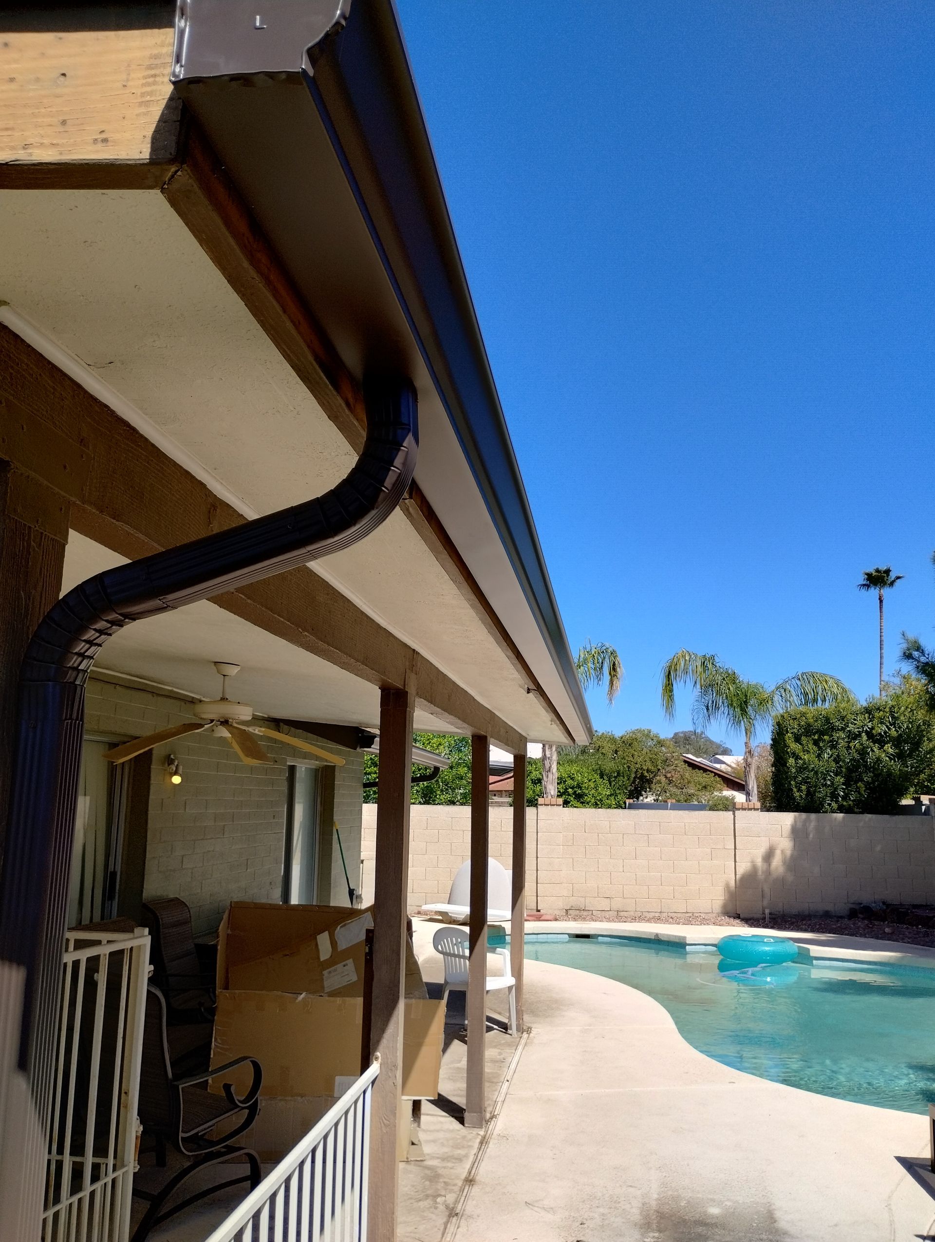 The Homeowner was having roof water coming down and bring along all the dirt, dust and bird droppings onto his patio and pool. We isntalled 6" Seamless Gutter and a 2"x3" Downspout to divert the water.