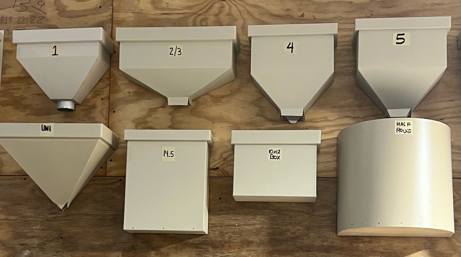 These are some examples of some standard box we can use to cover your scupper box and add Seamless Gutter below or connect a downspout. Custom design boxes are available.